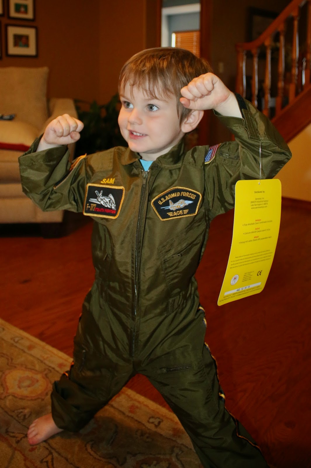 There isn't much that excites Sam more than airplanes right now, so for his birthday I ordered him his very own, Sam embroidered, fighter pilot's costume. You'd have thought we gave him the moon.